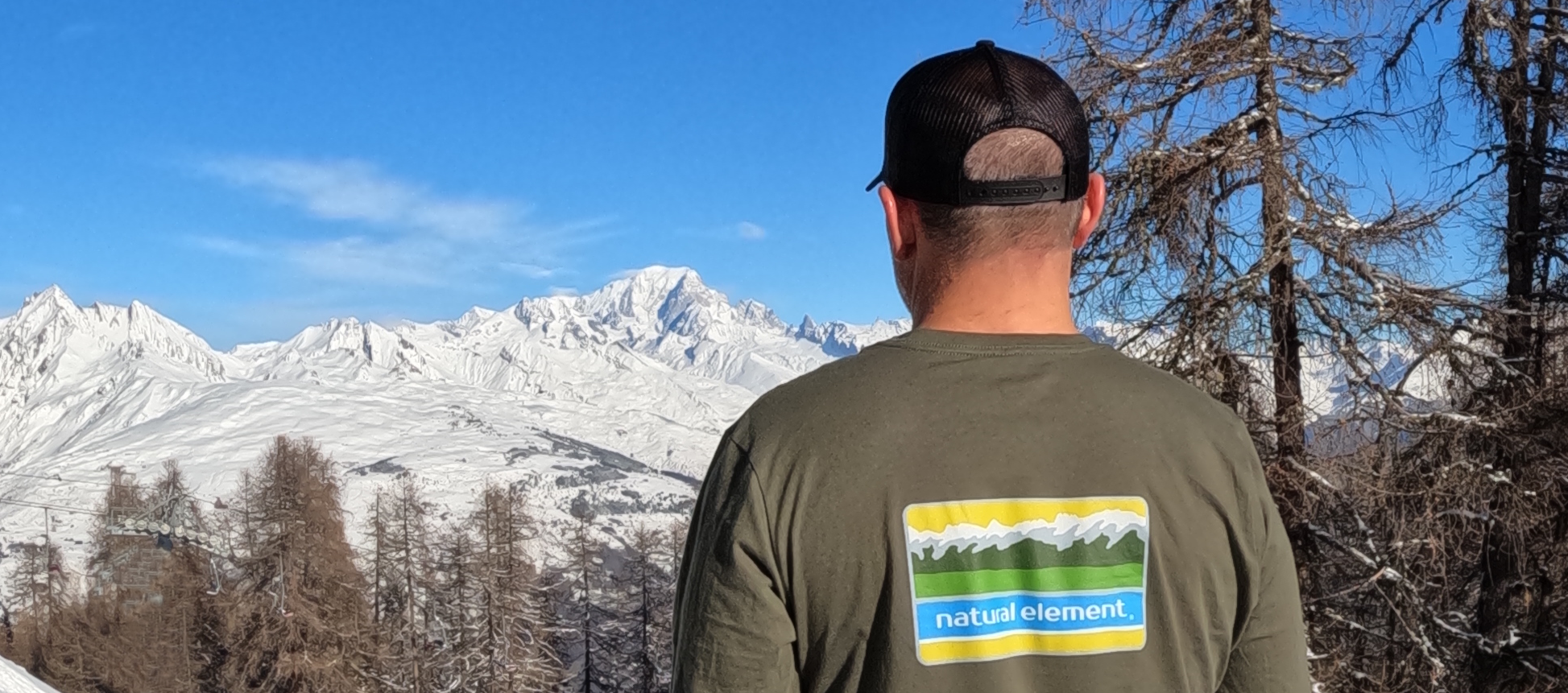 Print transfer on the front with natural element ® logo circle in black and natural element vertically print transferred on back in black